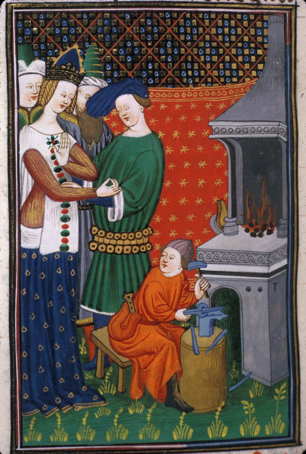 Londra, British Library, Royal 16 G V, f. 114v. Faustina insieme a tre amanti; un fabbro forgia del metallo su un'incudine.