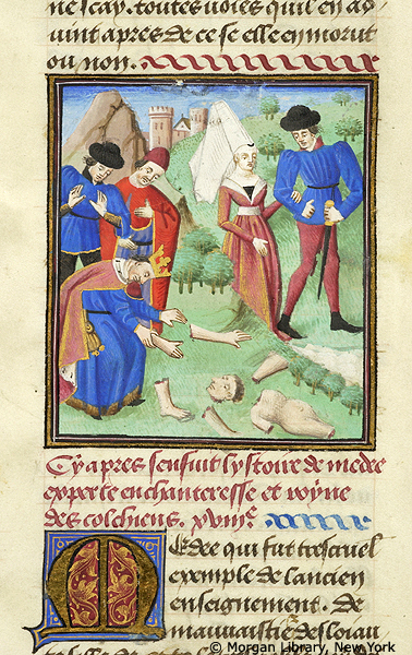 New York, Pierpont Morgan Library, M 381, f. 8r. Medea fugge insieme a Giasone dopo aver assassinato il fratello Apsirto; re Eete interrompe l'inseguimento per recuperare il corpo smembrato del figlio e darvi degna sepoltura.