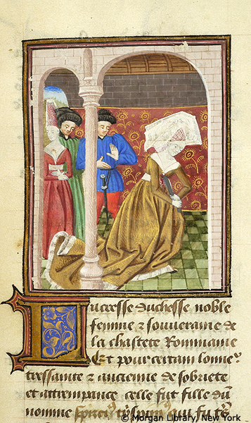 New York, Pierpont Morgan Library, M 381, f. 25r. Lucrezia compie il suicidio dinanzi ai suoi familiari.