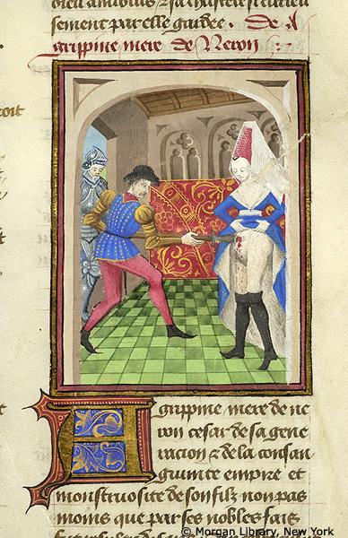 New York, Pierpont Morgan Library, M 381, f. 54r. Agrippina, madre di Nerone, viene raggiunta dai sicari inviati dal figlio e uccisa con una lancia.