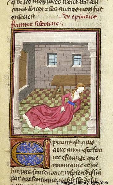 New York, Pierpont Morgan Library, M 381, f. 56r. Epicari viene impiccata all'interno di una cella.