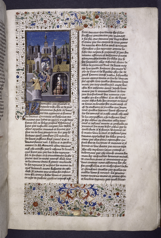 New York, Public Library, Spencer 33, f. 13r. Ipermestra si trova rinchiusa in prigione; Linceo, con l'aiuto di tre uomini, uccide Danao; durante la notte una delle sorelle di Ipermestra uccide il proprio marito nel sonno.