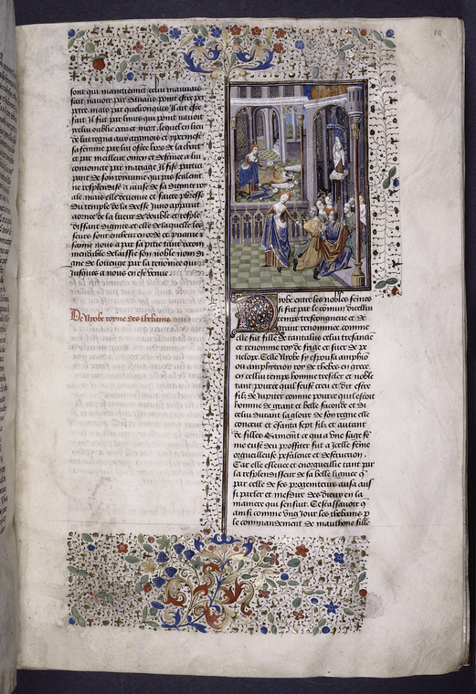 New York, Public Library, Spencer 33, f. 14r. Niobe tenta di distogliere i fedeli dall'adorazione della statua di Latona; Niobe piange la morte dei figli e del marito Anfione.