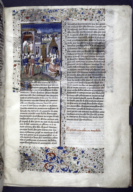 New York, Public Library, Spencer 33, f. 20r. Edipo sposa Giocasta; Edipo e Giocasta discutono nella loro camera da letto; sullo sfondo glie eserciti di Eteocle e Polinice si fronteggiano, osservati dalle loro sorelle.
