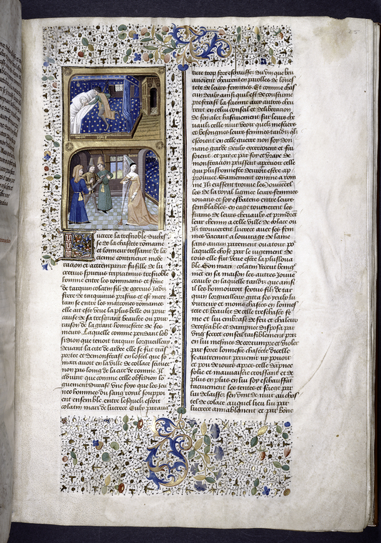 New York, Public Library, Spencer 33, f. 25r. Sesto Tarquinio si avvicina con la spada sguainata al letto dove dorme Lucrezia; Lucrezia compie il suicidio dinanzi al marito ed i familiari.