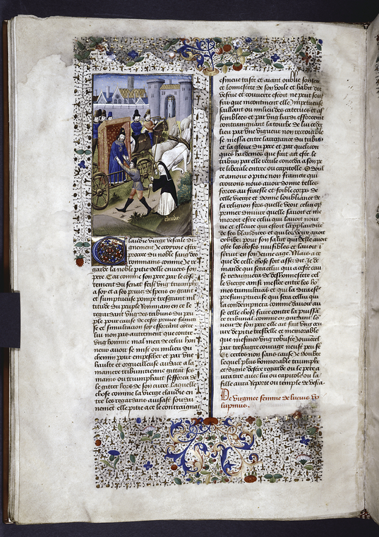 New York, Public Library, Spencer 33, f. 34v. Claudia, vestita da monaca, minaccia con un bastone l'uomo che tenta di trascinare suo padre giù dal carro trionfale che si dirige verso la città.