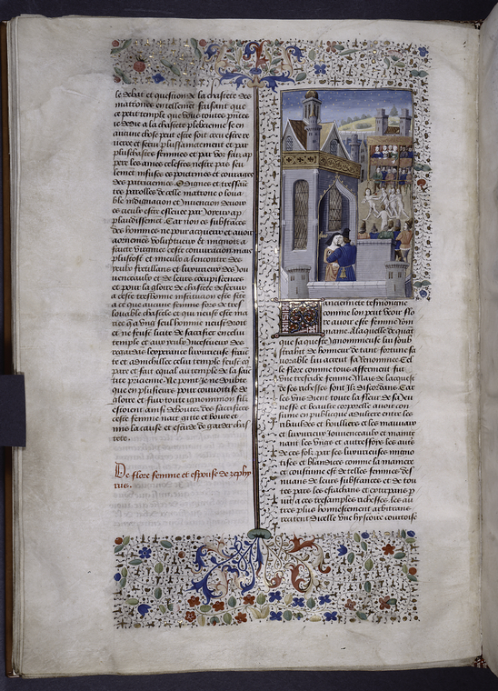 New York, Public Library, Spencer 33, f. 35v. Flora bacia un uomo dinanzi all'ingresso di una casa; si celebra la festa delle Floralie con un gruppo di fanciulle nude che danzano osservate dalla folla.