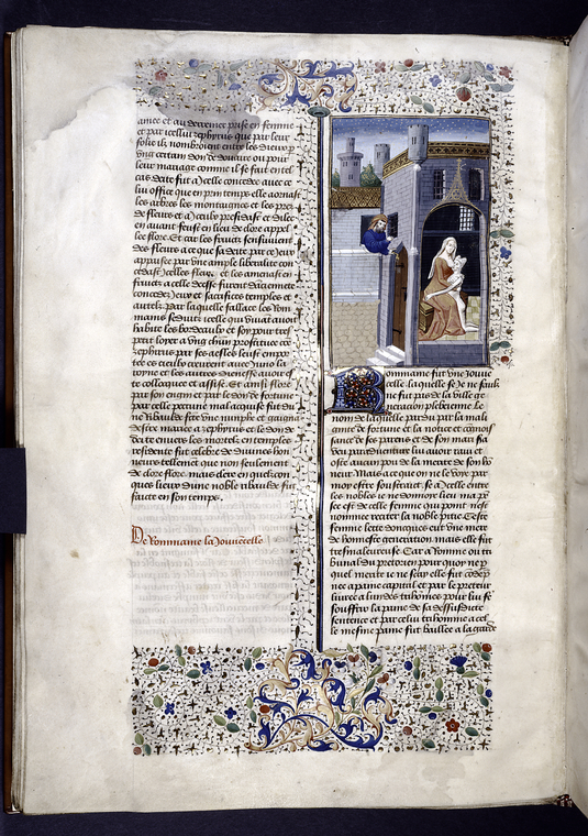 New York, Public Library, Spencer 33, f. 36v. Una giovane donna romana offre il proprio latte alla madre rinchiusa in prigione; all'esterno il carceriere le osserva da una finestra.