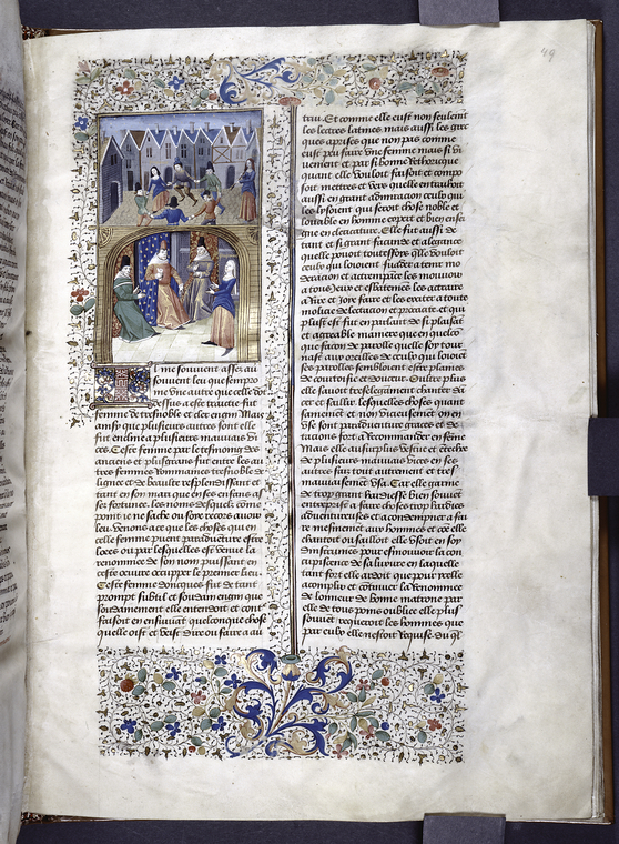 New York, Public Library, Spencer 33, f. 49r. Sempronia esibisce le sue capacità oratorie dinanzi a tre nobili; Sempronia danza con un gruppo di uomini nella piazza di un villaggio.