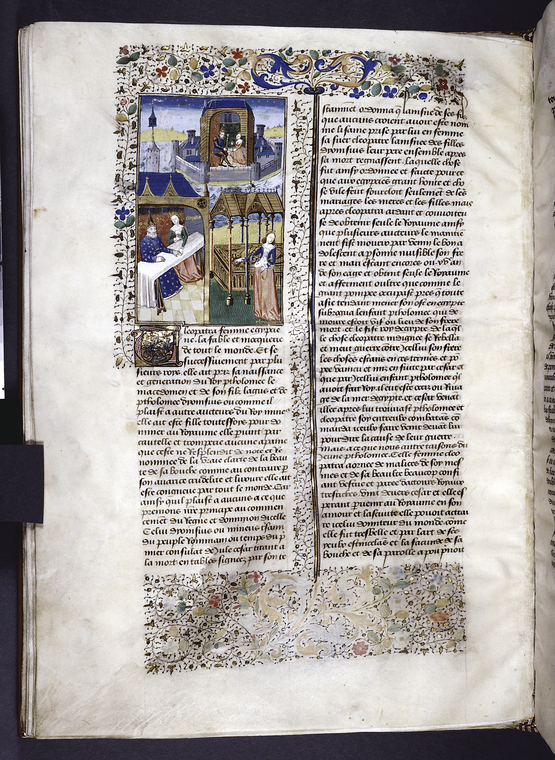 New York, Public Library, Spencer 33, f. 53v. Antonio e Cleopatra seduti a banchetto; Cleopatra in piedi accanto al sarcofago di Marco Antonio; sullo sfondo, in un interno, Cleopatra si inginocchia ai piedi di Ottaviano per supplicarlo.