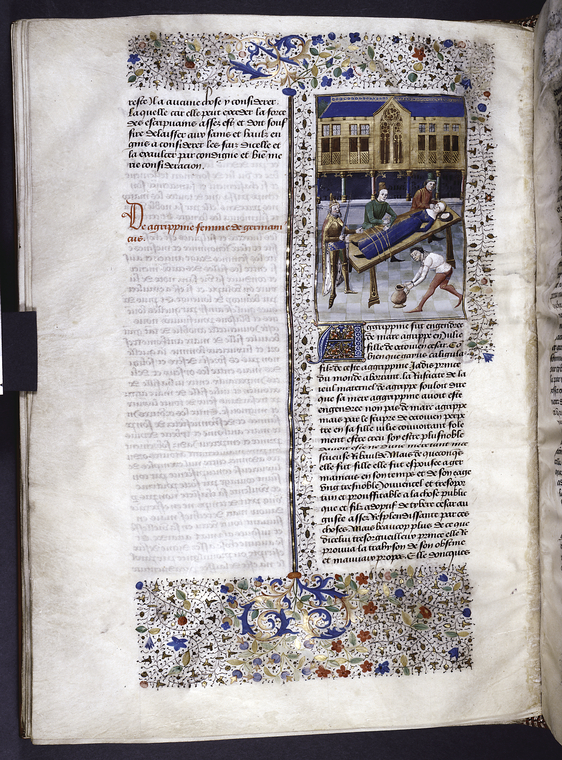 New York, Public Library, Spencer 33, f. 56v. Agrippina, vedova di Germanico, viene legata ad un tavolo e nutrita a forza per ordine di Tiberio.