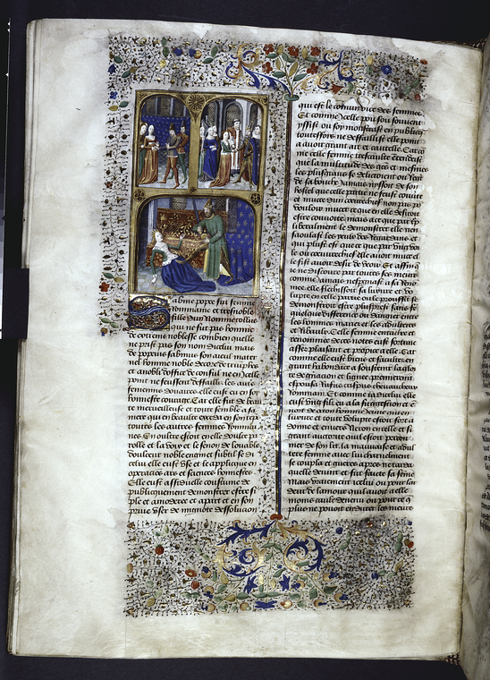New York, Public Library, Spencer 33, f. 62v. Due uomini e due donne si fronteggiano in una sala; il matrimonio di Nerone e Poppea Sabina; Nerone, brandendo una spada, spinge Poppea fuori dal letto e la prende a calci fino ad ucciderla.
