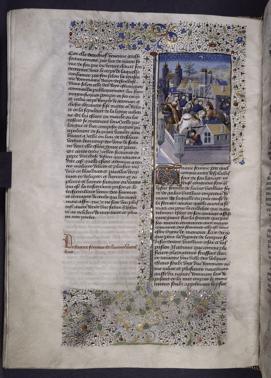 New York, Public Library, Spencer 33, f. 63v. Triaria partecipa a cavallo alla cruenta battaglia all'interno della città.