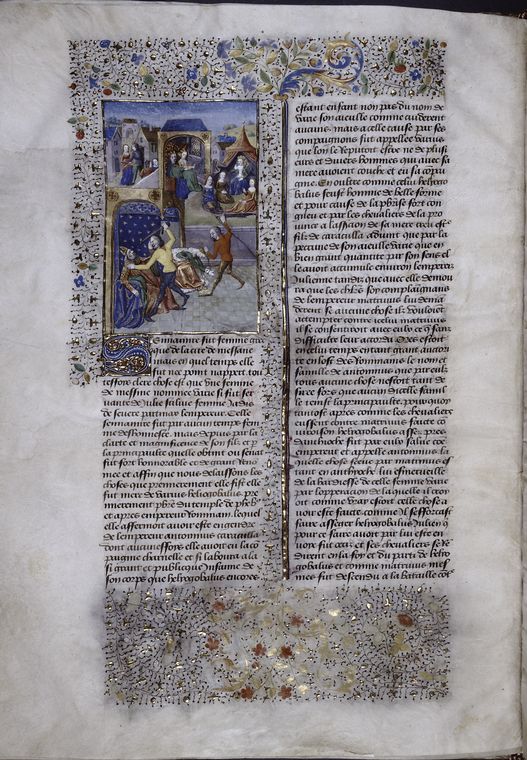 New York, Public Library, Spencer 33, f. 66v. Semiamira si prostituisce; Semiamira appare in Senato al fianco del figlio, l'imperatore Antonio (Eliogabalo); Semiamira presiede il senaculum, rappresentato da tre matrone romane; Semiamira ed Antonio vengono assassinati da due uomini.