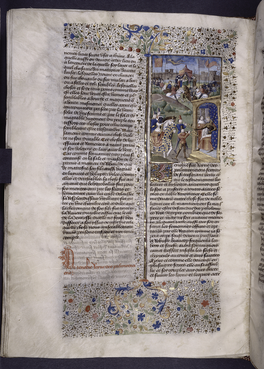 New York, Public Library, Spencer 33, f. 67v. Zenobia viene portata prigioniera dinanzi all'imperatore durante il trionfo; sullo sfondo, guerrieri romani e palmiri si danno battaglia (rappresentati come cavalieri che si sfidano a una giostra).