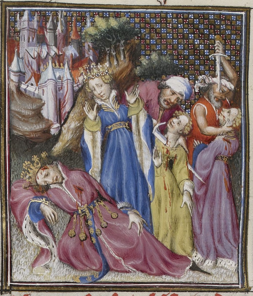 Parigi, Bibliothèque Nationale de France, Fr. 598, f. 47v. Ecuba, moglie di Priamo, assiste alla morte del marito e dei figli per mano dei soldati greci; sullo sfondo, la città di Troia in fiamme.