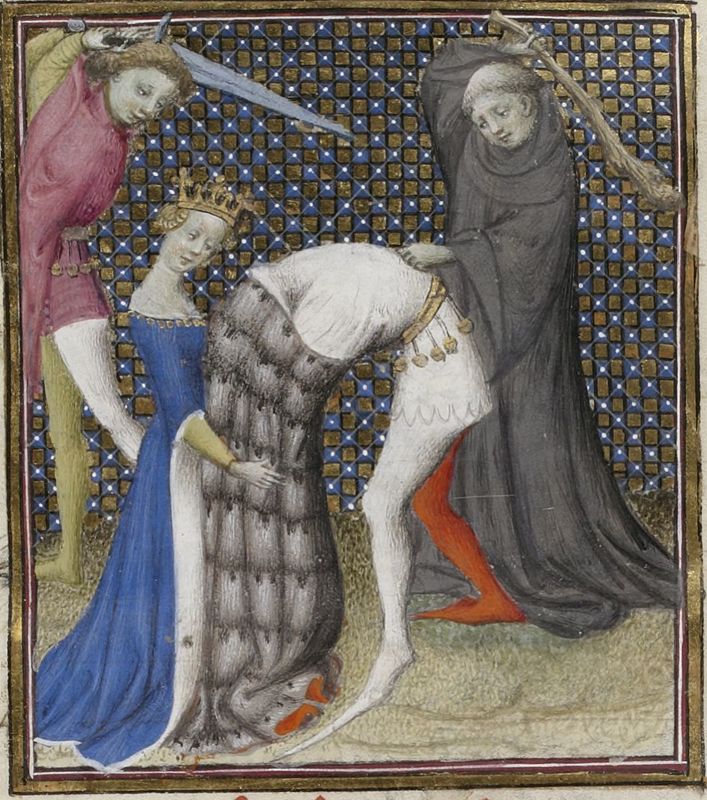Parigi, Bibliothèque Nationale de France, Fr. 598, f. 49v. Clitennestra aiuta suo marito Agamennone a togliersi il mantello, complice dell'amante Egisto che si prepara ad ucciderlo con l'aiuto di un servitore armato di bastone.