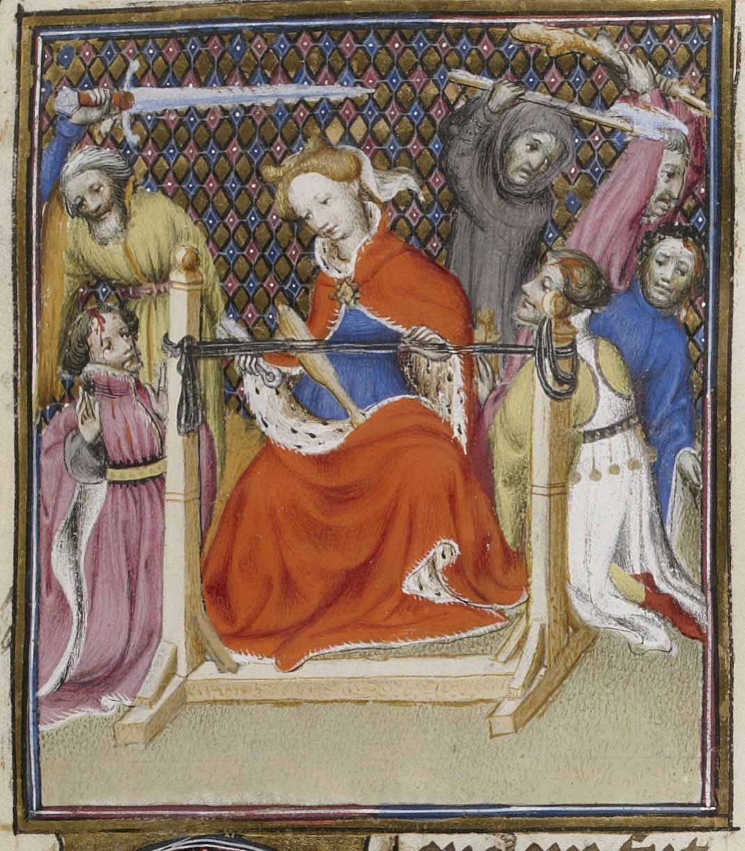 Parigi, Bibliothèque Nationale de France, Fr. 598, f. 58r. Tornato a Itaca sotto mentite spoglie, Ulisse con l'aiuto del figlio Telemaco e di un servitore uccide i pretendenti di Penelope, che assiste al massacro seduta al telaio.
