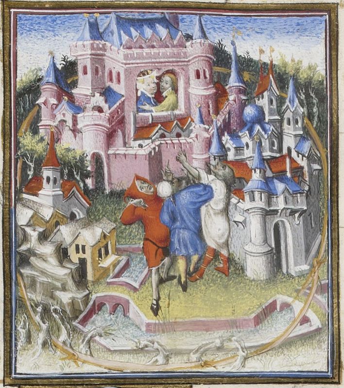 Parigi, Bibliothèque Nationale de France, Fr. 598, f. 61v. Didone ed Enea si trovano in un palazzo all'interno della città di Cartagine, i cui confini sono segnati da strisce di pelle di bue; all'esterno del palazzo si trovano tre uomini.
