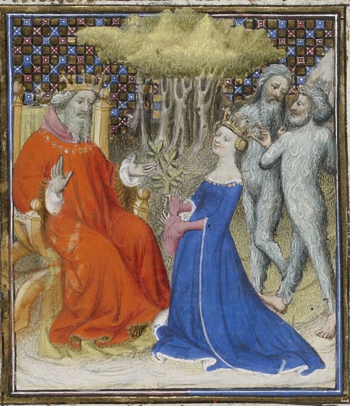 Parigi, Bibliothèque Nationale de France, Fr. 598, f. 67v. La regina di Saba Nicaula, accompagnata da due etiopi raffigurati come selvaggi, si reca al cospetto del re Salomone e gli offre un ramo di balsamino.