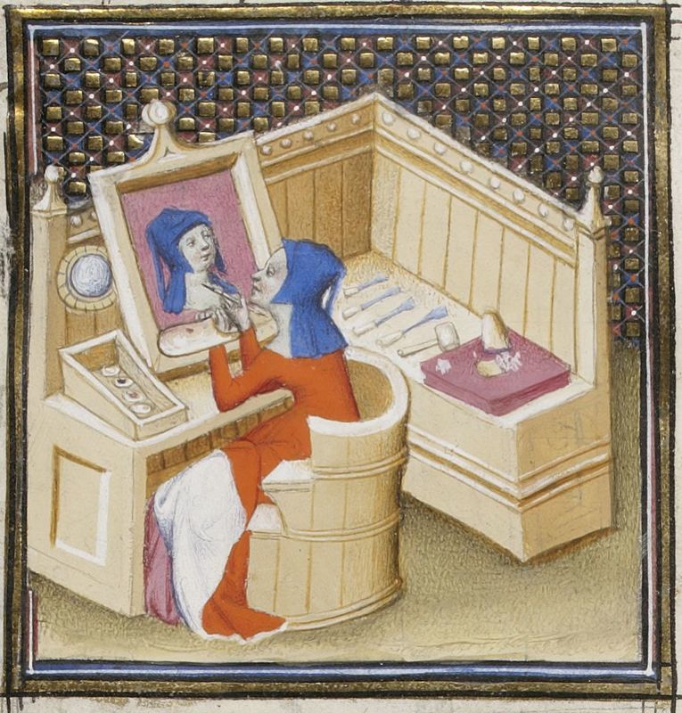Parigi, Bibliothèque Nationale de France, Fr. 598, f. 100v. Marzia dipinge il proprio autoritratto dinanzi allo specchio.