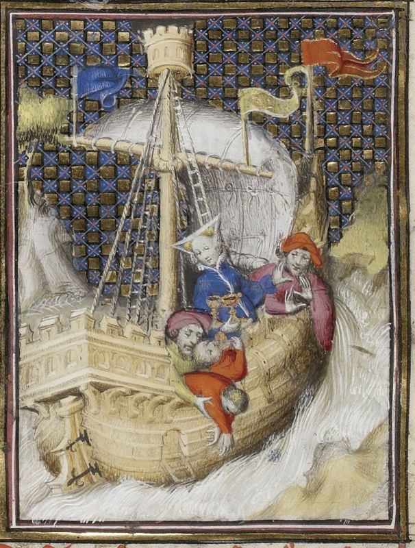Parigi, Bibliothèque Nationale de France, Fr. 598, f. 107r. Teossena avvelena i suoi nipoti e ne fa gettare i cadaveri in mare.