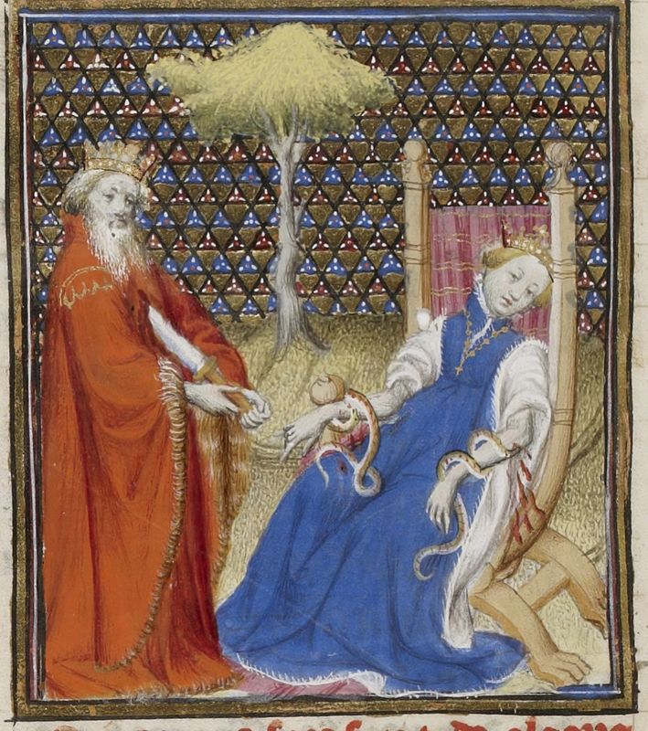 Parigi, Bibliothèque Nationale de France, Fr. 598, f. 128v. Cleopatra compie il suicidio facendosi mordere da due aspidi velenosi, mentre Marco Antonio si pugnala con una spada.