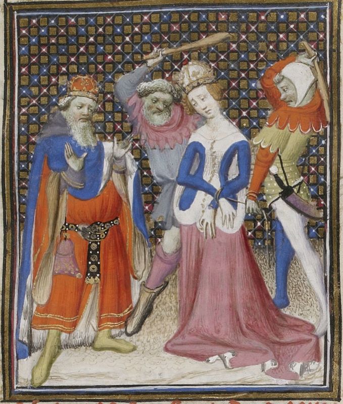 Parigi, Bibliothèque Nationale de France, Fr. 598, f. 136r. Agrippina viene bastonata a morte per ordine del figlio Nerone.