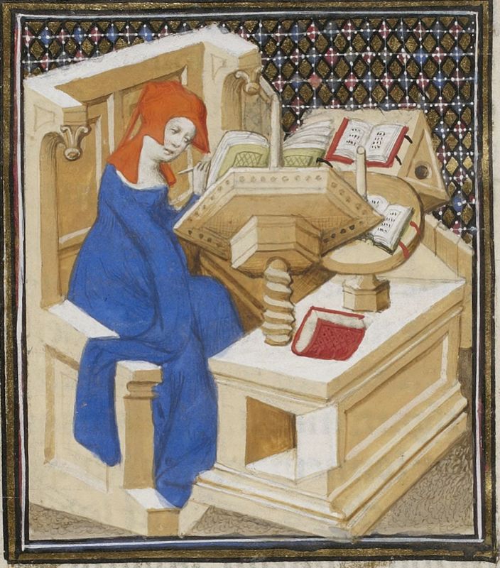 Parigi, Bibliothèque Nationale de France, Fr. 598, f. 143v. Proba seduta allo scrittoio nel suo studio.