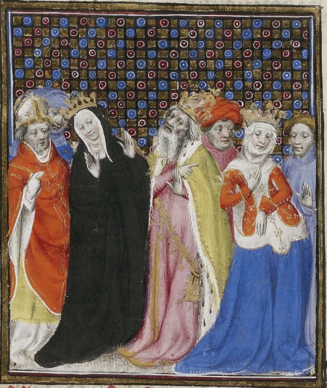 Parigi, Bibliothèque Nationale de France, Fr. 598, f. 154v. Costanza d'Altavilla, vestita in abiti monastici, abbandona la vita nel convento per sposare Enrico VI e diventare imperatrice.