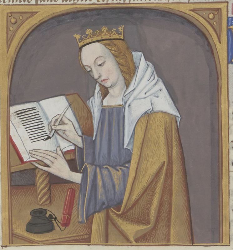 Parigi, Bibliothèque Nationale de France, Fr. 599, f. 22v. Il copista del manoscritto è Johannes Michel. Carmenta scrive un libro.