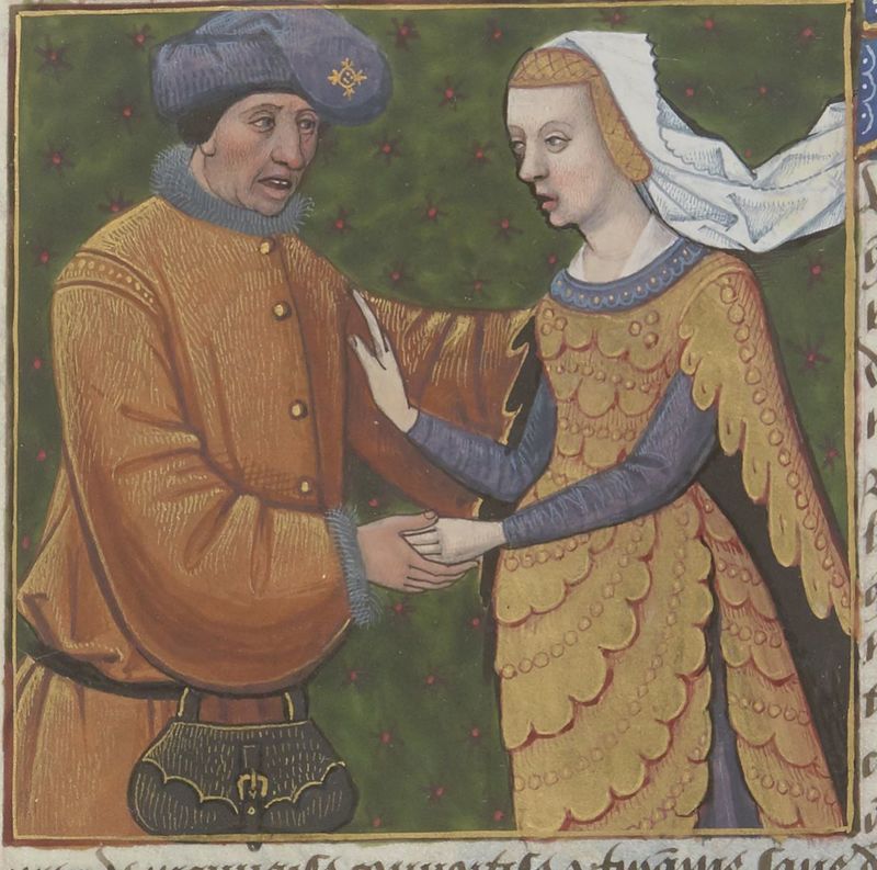 Parigi, Bibliothèque Nationale de France, Fr. 599, f. 40v. Il copista del manoscritto è Johannes Michel. Rea Silvia e suo zio Numitore (?).