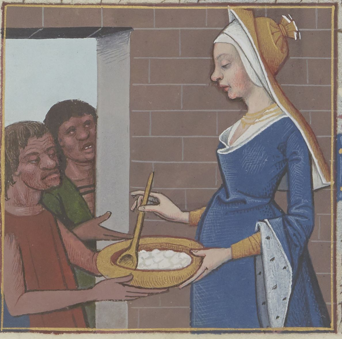 Parigi, Bibliothèque Nationale de France, Fr. 599, f. 59v. Il copista del manoscritto è Johannes Michel. Busa di Canosa distribuisce il cibo ai soldati romani.