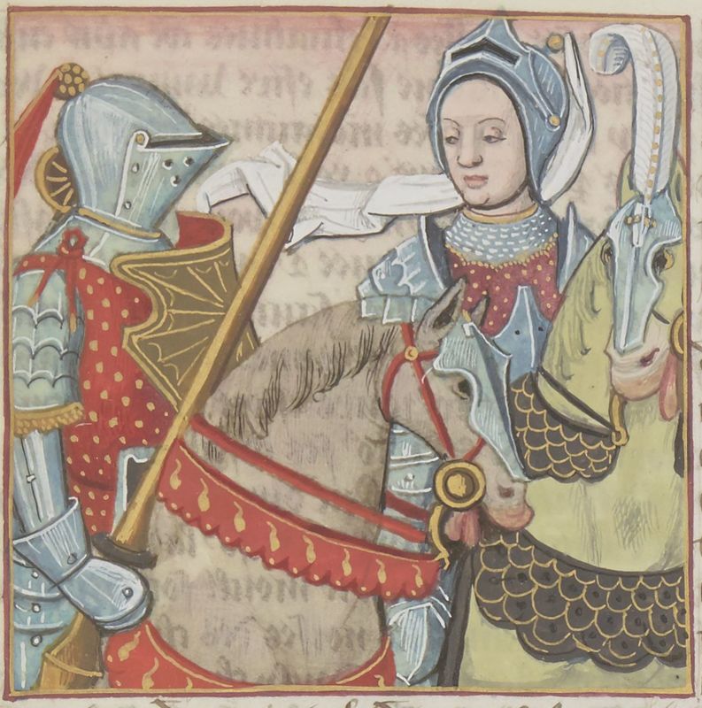 Parigi, Bibliothèque Nationale de France, Fr. 599, f. 67r. Il copista del manoscritto è Johannes Michel. Ipsicratea in armatura cavalca con il marito verso la battaglia.