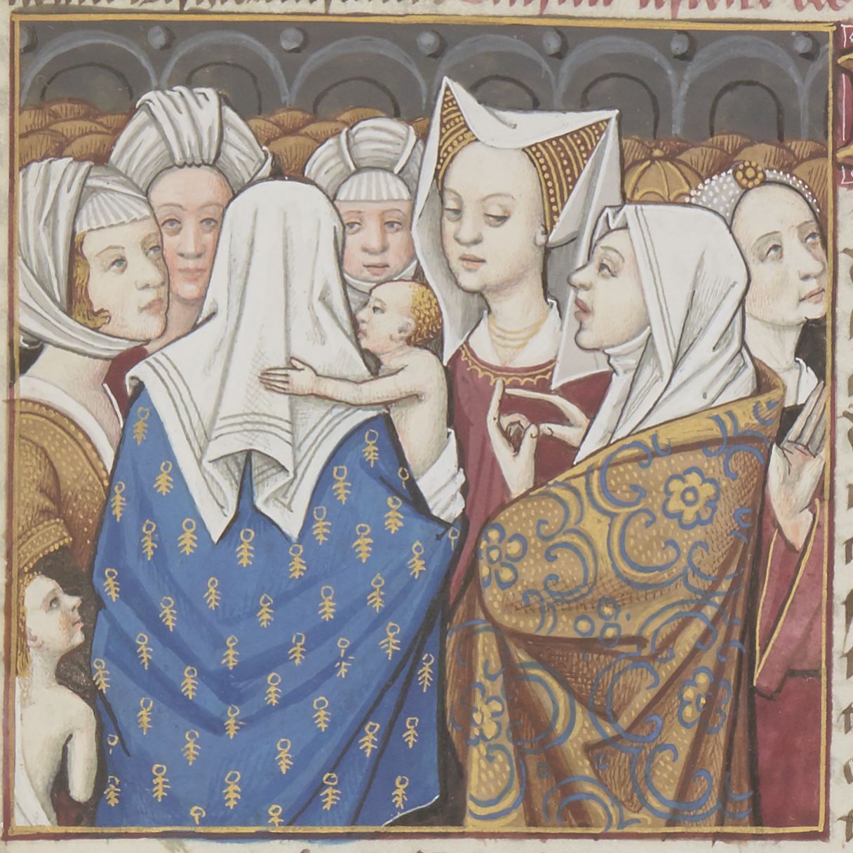 Parigi, Bibliothèque Nationale de France, Fr. 599, f. 69r. Il copista del manoscritto è Johannes Michel. Le mogli dei Cimbri con i figli neonati.