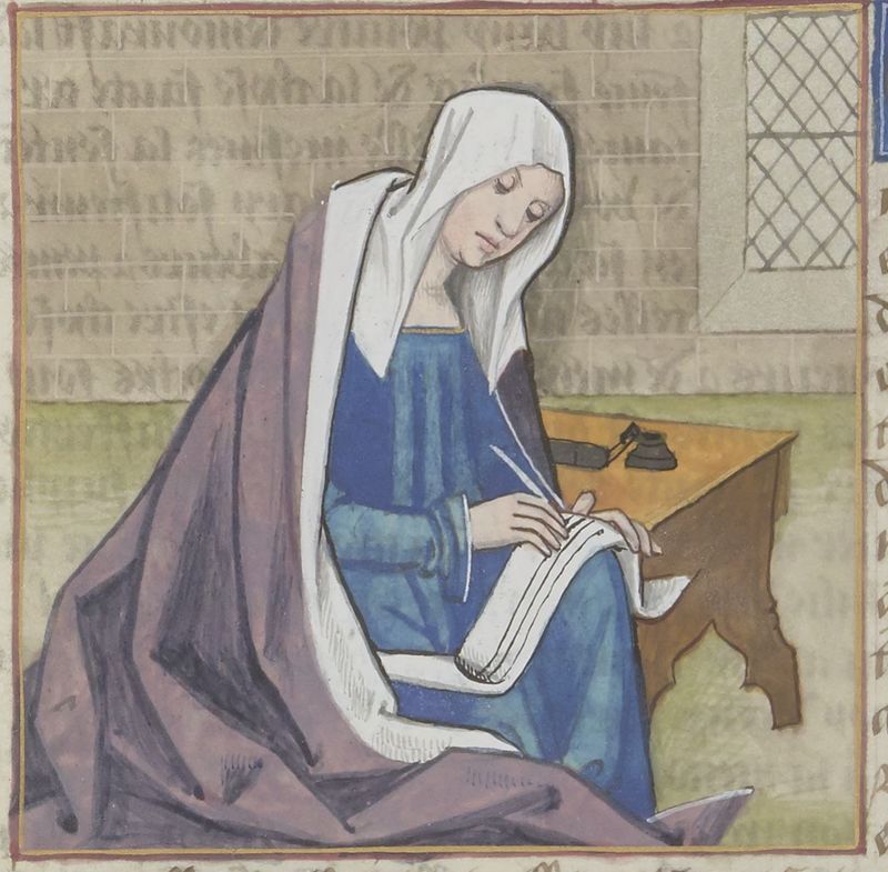 Parigi, Bibliothèque Nationale de France, Fr. 599, f. 72v. Il copista del manoscritto è Johannes Michel. La poetessa Cornificia intenta a scrivere.