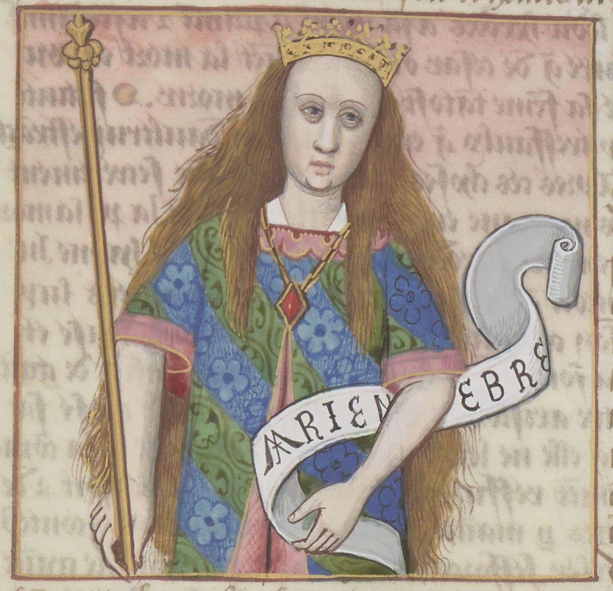 Parigi, Bibliothèque Nationale de France, Fr. 599, f. 73r. Il copista del manoscritto è Johannes Michel. Marianna, regina dei Giudei, con una pergamena su cui è scritto il suo nome.