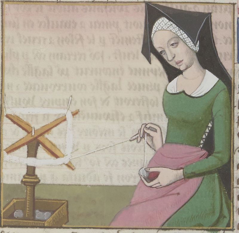 Parigi, Bibliothèque Nationale de France, Fr. 599, f. 79v. Il copista del manoscritto è Johannes Michel. Epicari arrotola un gomitolo di filo.