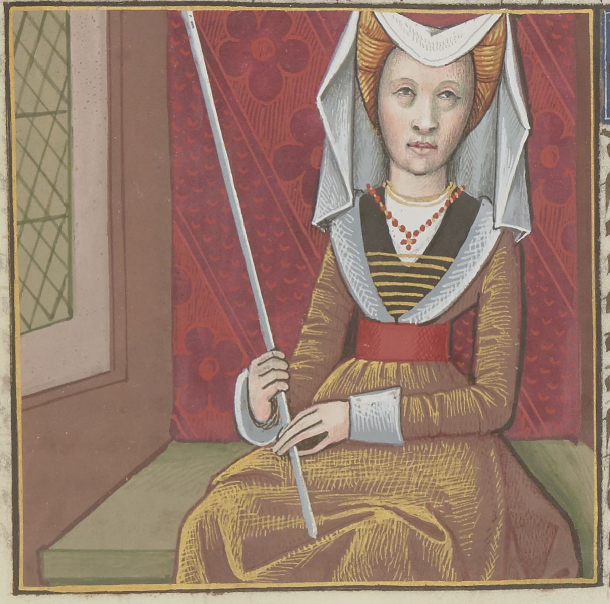 Parigi, Bibliothèque Nationale de France, Fr. 599, f. 90r. Il copista del manoscritto è Johannes Michel. Costanza d'Altavilla seduta sul trono.