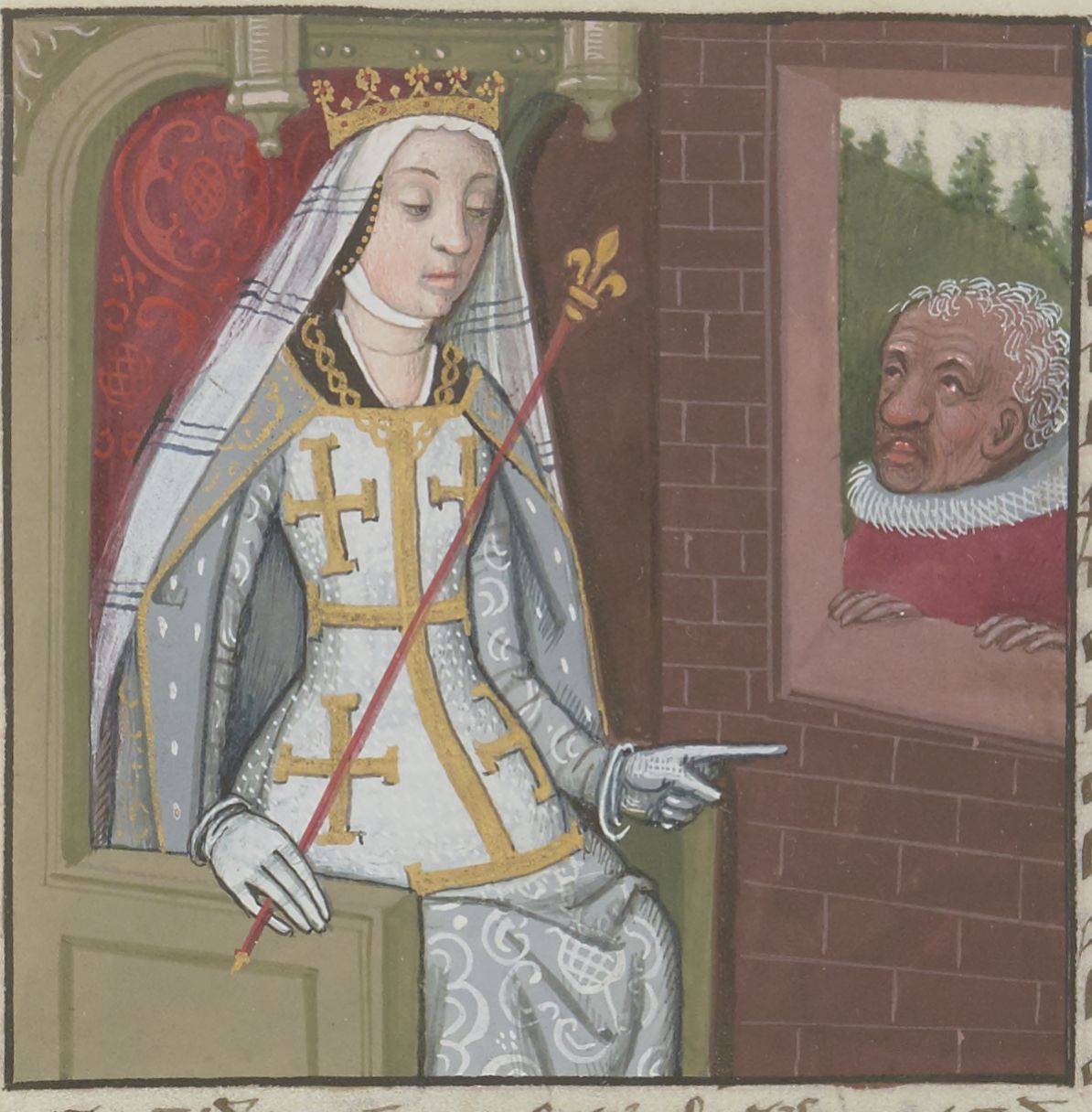 Parigi, Bibliothèque Nationale de France, Fr. 599, f. 93v. Il copista del manoscritto è Johannes Michel. La regina Giovanna I in trono si rivolge a un servitore.