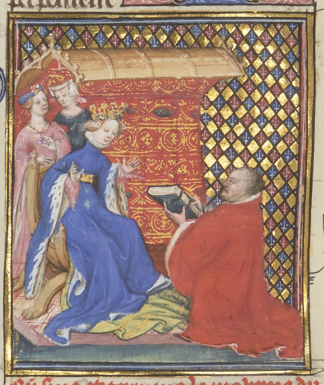 Parigi, Bibliothèque Nationale de France, Fr. 12420, f. 4v. L'autore Giovanni Boccaccio offre il libro alla contessa d'Altavilla circondata dal suo seguito.