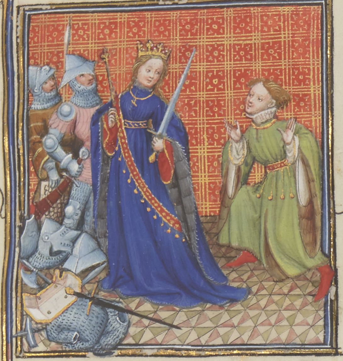 Parigi, Bibliothèque Nationale de France, Fr. 12420, f. 8r. Semiamira, regina di Babilonia, impugna le armi per guidare l'esercito mentre si volge verso il figlio Ninia.