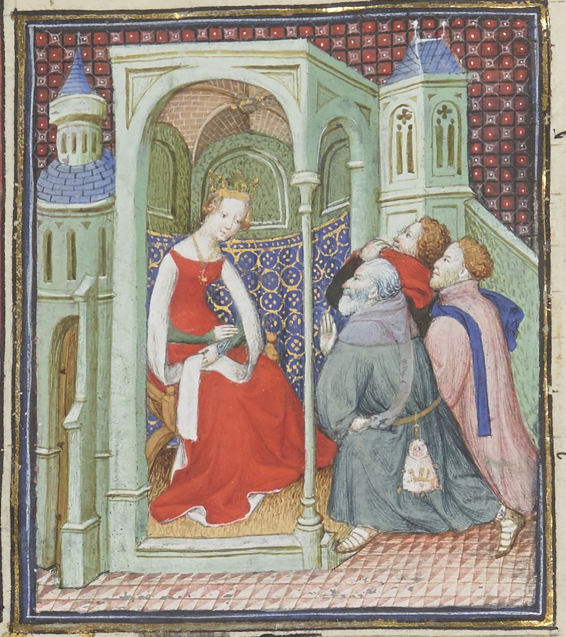 Parigi, Bibliothèque Nationale de France, Fr. 12420, f. 18v. La regina Libia siede nella sala del trono e riceve alcuni ammiratori.