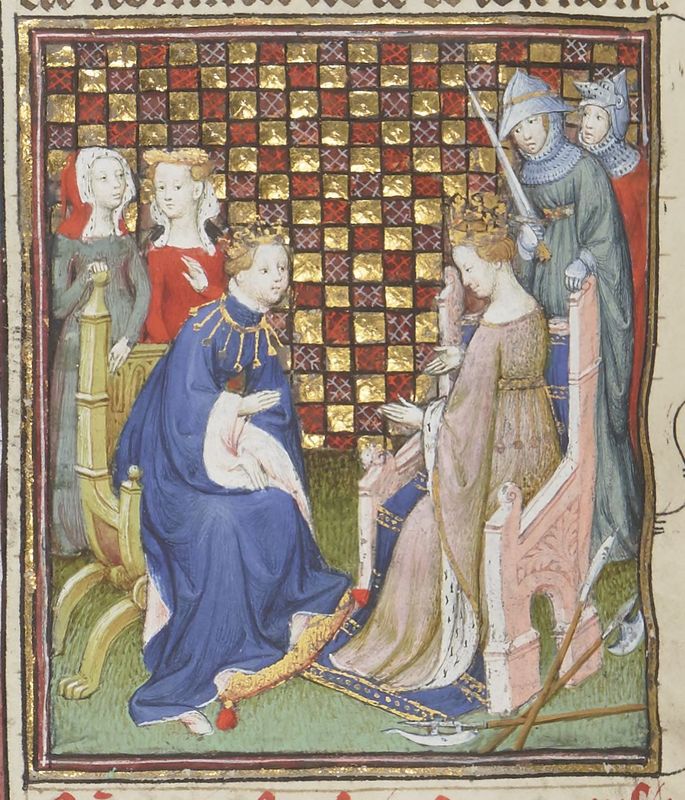 Parigi, Bibliothèque Nationale de France, Fr. 12420, f. 18v. Marpesia e Lampedone, regine delle Amazzoni, siedono sui troni circondate dalle donne del loro seguito, alcune delle quali armate.
