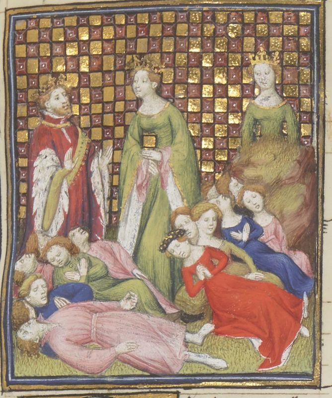 Parigi, Bibliothèque Nationale de France, Fr. 12420, f. 24r. Niobe e il marito Anfione piangono la morte dei loro figli; Niobe viene trasformata in una roccia.