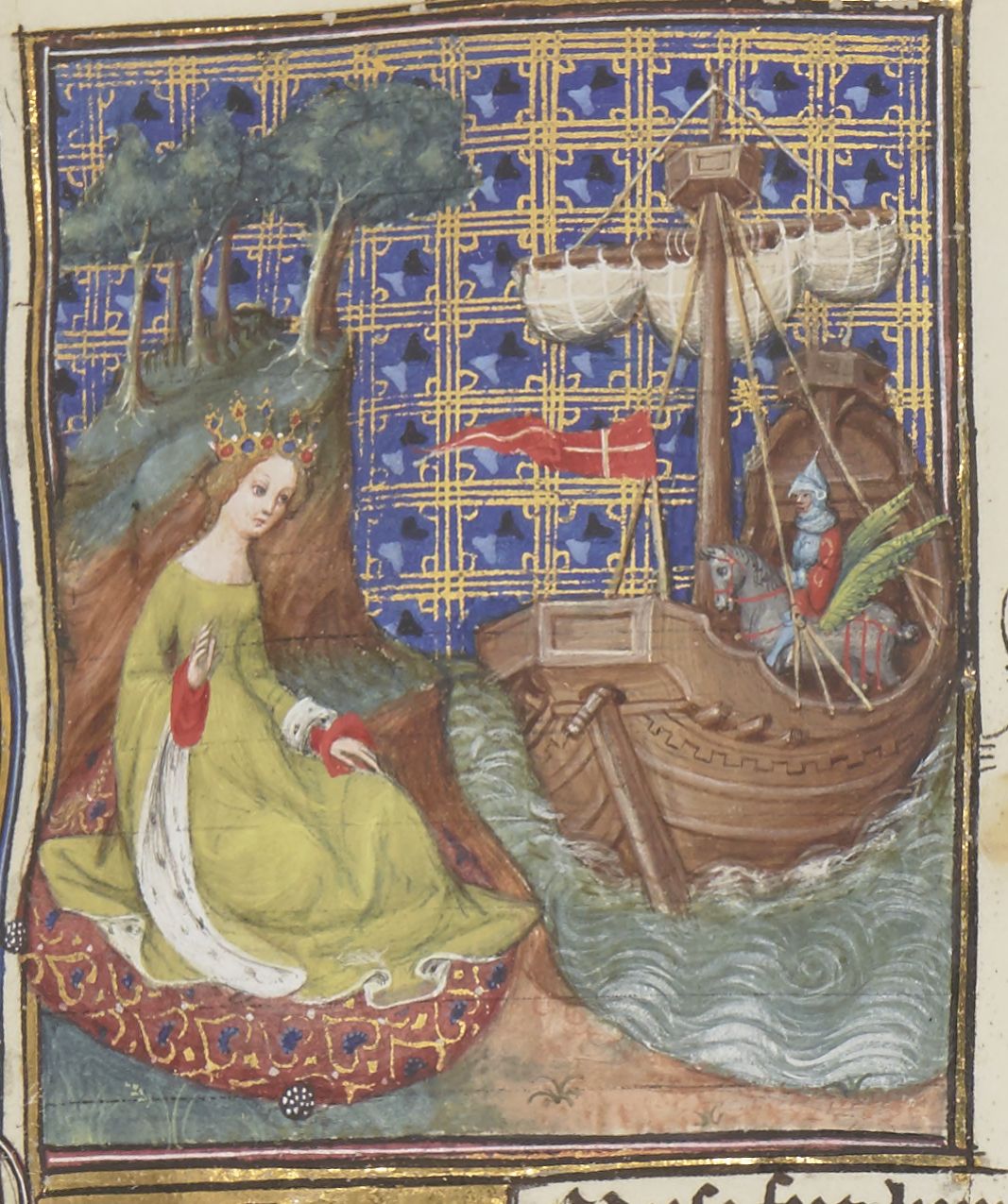 Parigi, Bibliothèque Nationale de France, Fr. 12420, f. 31r. Perseo sbarca a cavallo di Pegaso sulla spiaggia dove lo attende Medusa.