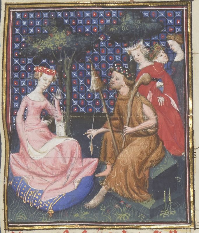 Parigi, Bibliothèque Nationale de France, Fr. 12420, f. 32r. Iole siede nel giardino accanto ad Ercole, intento a filare, e tre fanciulle.