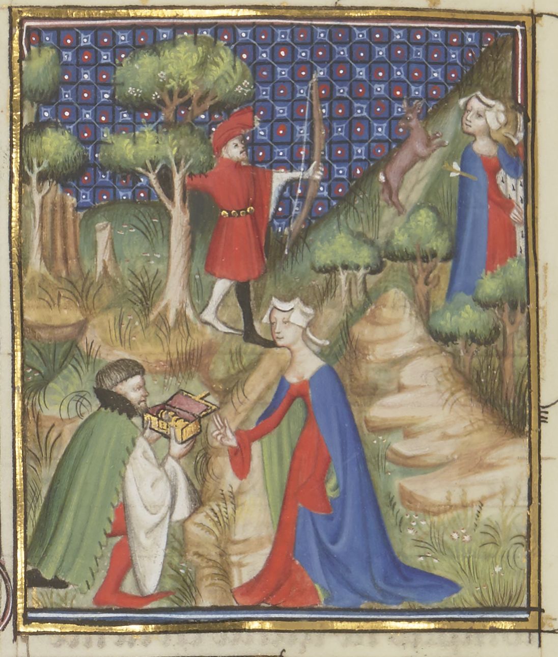 Parigi, Bibliothèque Nationale de France, Fr. 12420, f. 39v. Cefalo travestito tenta di corrompere la moglie Procri con del denaro; Procri, nascosta nella foresta, viene ferita mortalmente dal marito con una freccia.
