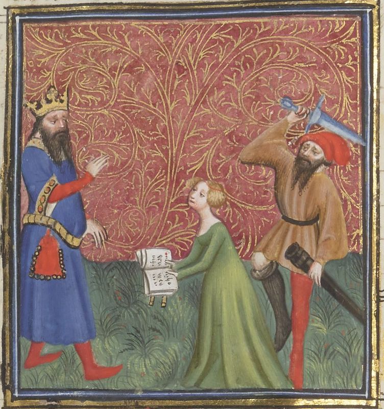 Parigi, Bibliothèque Nationale de France, Fr. 12420, f. 48v. Cassandra, con un libro in mano, predice ad Agamennone la propria morte prima di essere uccisa.