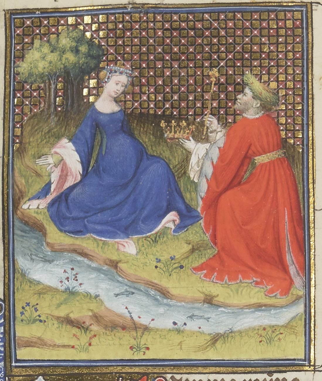 Parigi, Bibliothèque Nationale de France, Fr. 12420, f. 60v. Enea offre la sua corona e il suo scettro a Lavinia.